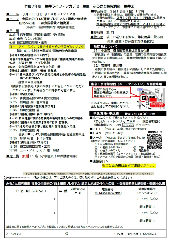 福井ライフ・アカデミー主催 令和7年度 ふるさと探究講座 福井②全国初の「日本遺産プレミアム」認定と地域活性化への道 ~御食国若狭と鯖街道~