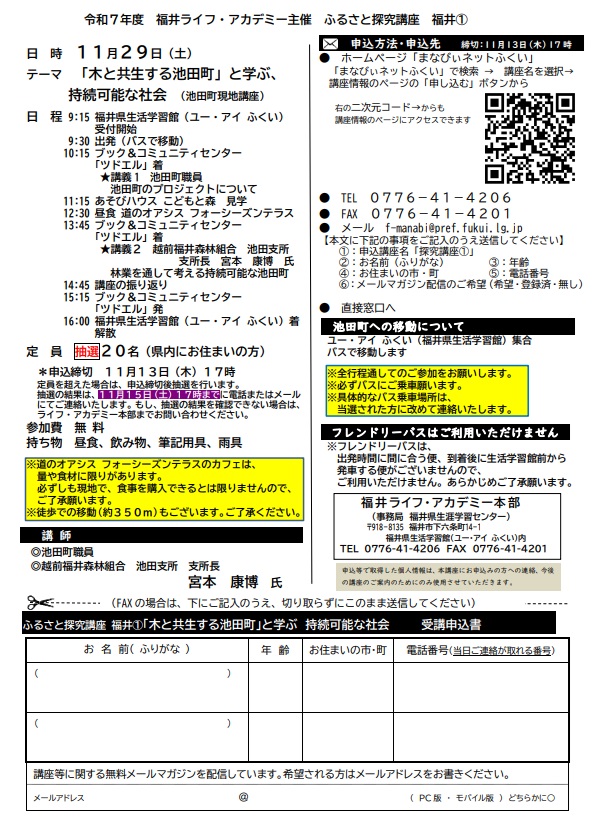 | 抽選 20名 定員を超えた場合は、申込締切後に抽選を行います。 抽選結果は、11月15日(土)17:00までに電話またはメールにてご連絡いたします。 もし結果を確認できない場合は、福井ライフ・アカデミー本部までお問い合わせください。 |