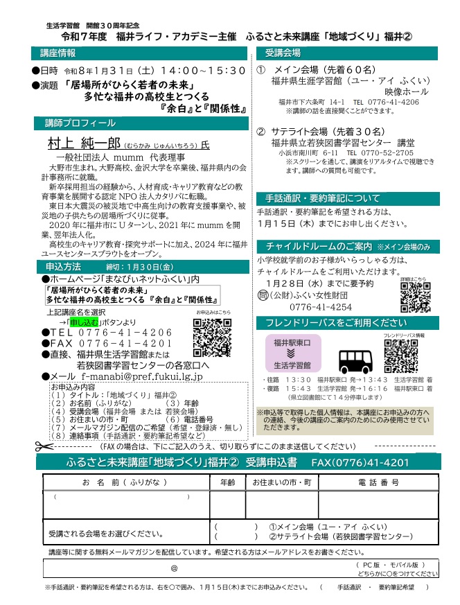 福井ライフ・アカデミー本部福井市下六条町14-1 県生活学習館内