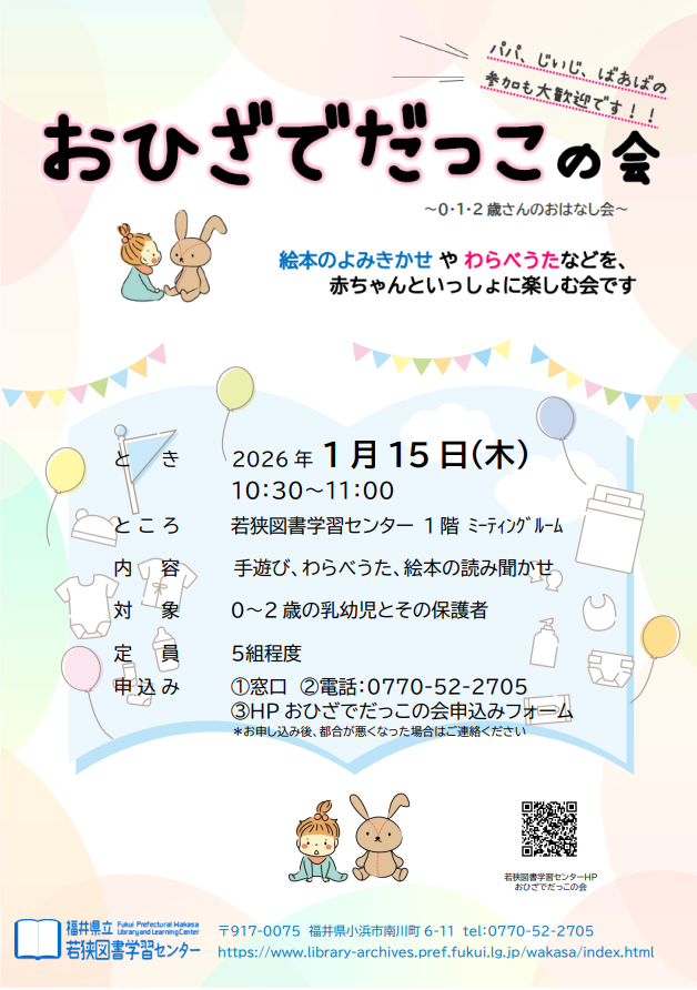 - 申込フォーム →▶【1月15日】おひざでだっこの会申込フォームにてお申し込みください。