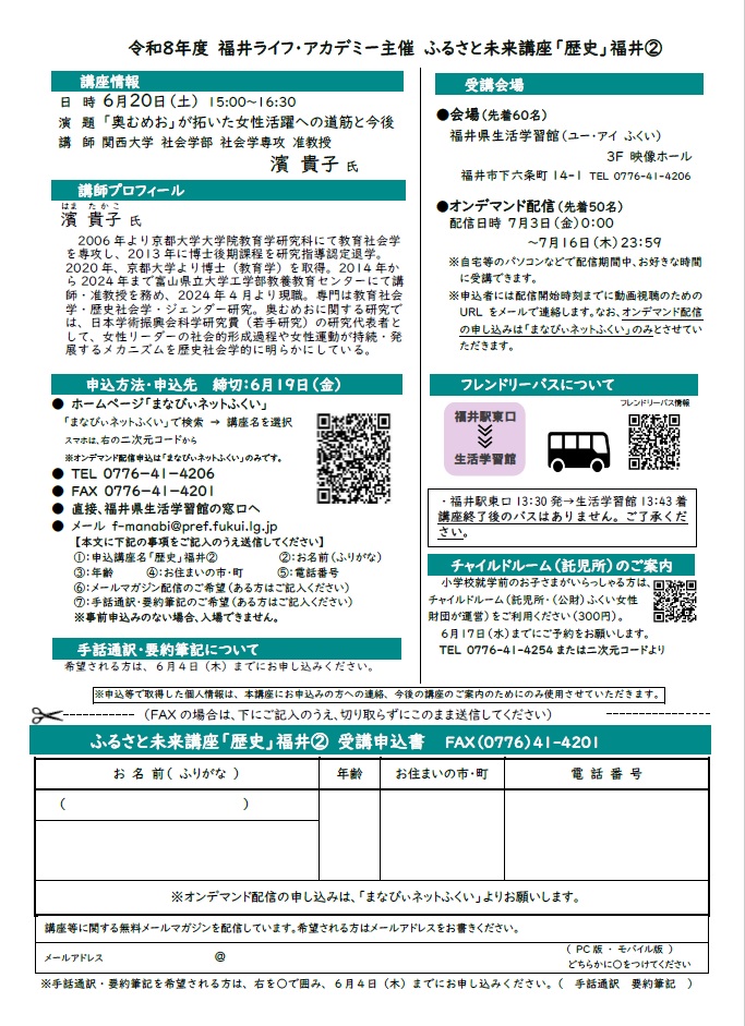 内容ないよう 約100年前、福井市出身の奥むめおは、女性が社会に参加する道が限られた時代に、女性運動や消費者運動を通して女性たちの活躍の場を切り拓きました。本講座では、戦前から戦後にかけて長きにわたり取り組まれてきた、女性の社会的地位を向上させる運動の歩みを振り返ります。